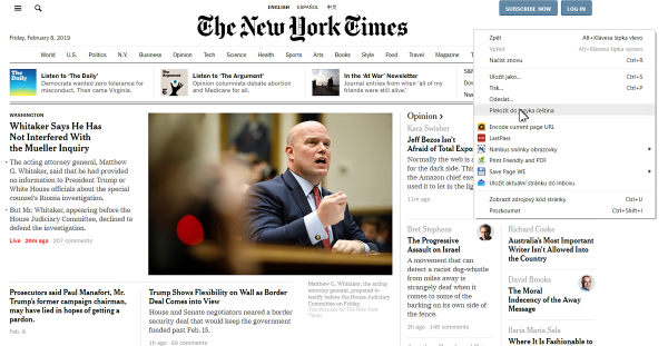 Příklad: The New York Times (Titulní stránka vlevo) - Friday, February 8, 2019. Po klepnutí pravým tlačítkem myši se objeví seznam akcí, kde klepneme na možnost